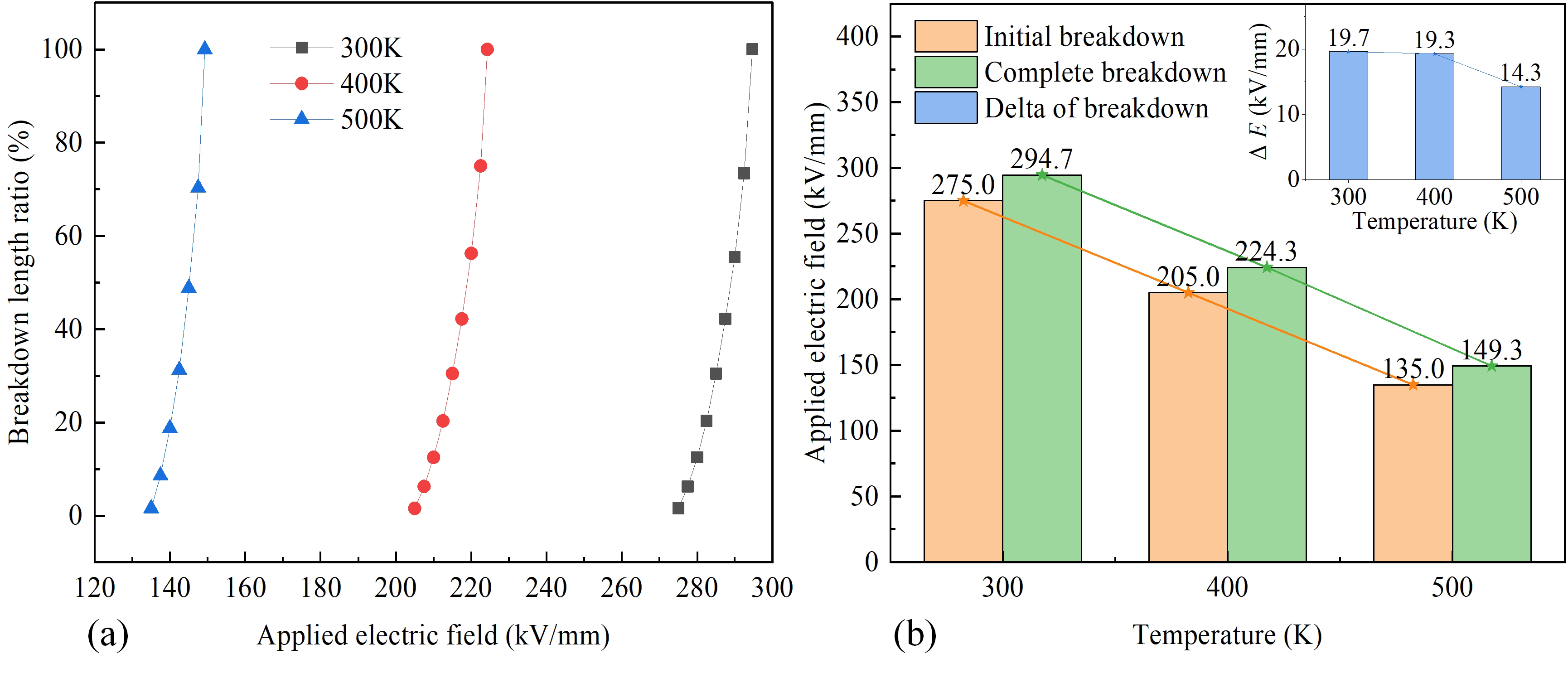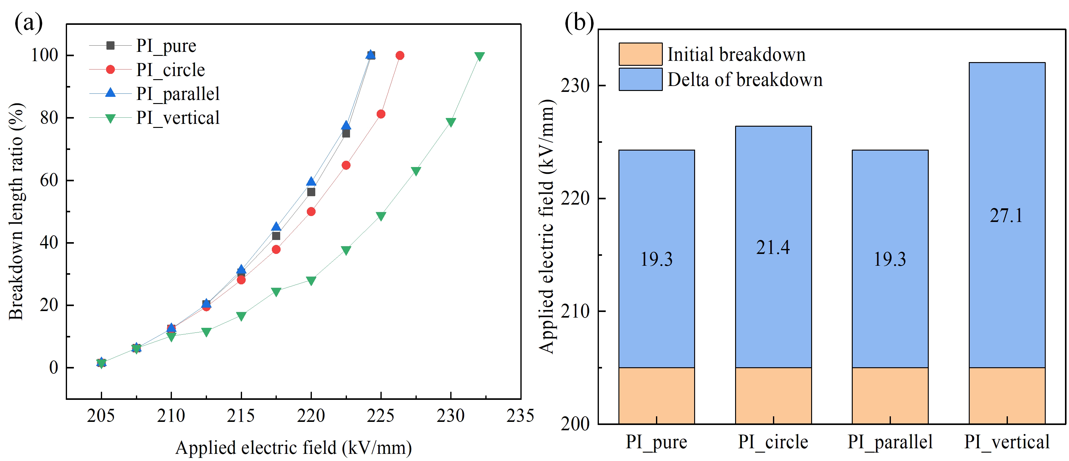 In contrast to conventional transformers, power electronic transformers, as an integral component of new energy power system, are often subjected to high-frequency and transient electrical stresses, leading to heightened concerns regarding insulation failures. Meanwhile, the underlying mechanism behind discharge breakdown failure and nanofiller enhancement under high-frequency electrical stress remains unclear. An electric-thermal coupled discharge breakdown phase field model was constructed to study the evolution of the breakdown path in polyimide nanocomposite insulation subjected to high-frequency stress. The investigation focused on analyzing the effect of various factors, including frequency, temperature, and nanofiller shape, on the breakdown path of Polyimide (PI) composites. Additionally, it elucidated the enhancement mechanism of nano-modified composite insulation at the mesoscopic scale. The results indicated that with increasing frequency and temperature, the discharge breakdown path demonstrates accelerated development, accompanied by a gradual dominance of Joule heat energy. This enhancement is attributed to the dispersed electric field distribution and the hindering effect of the nanosheets. The research findings offer a theoretical foundation and methodological framework to inform the optimal design and performance management of new insulating materials utilized in high-frequency power equipment.