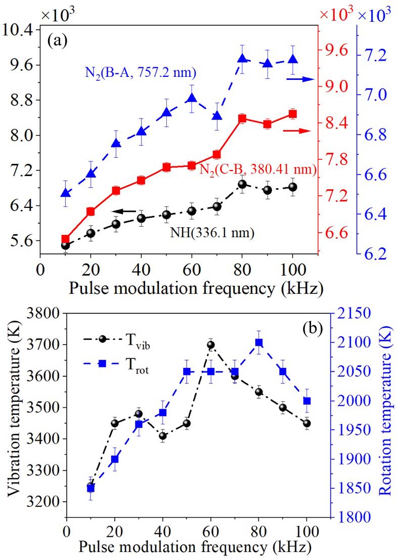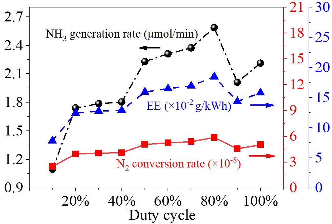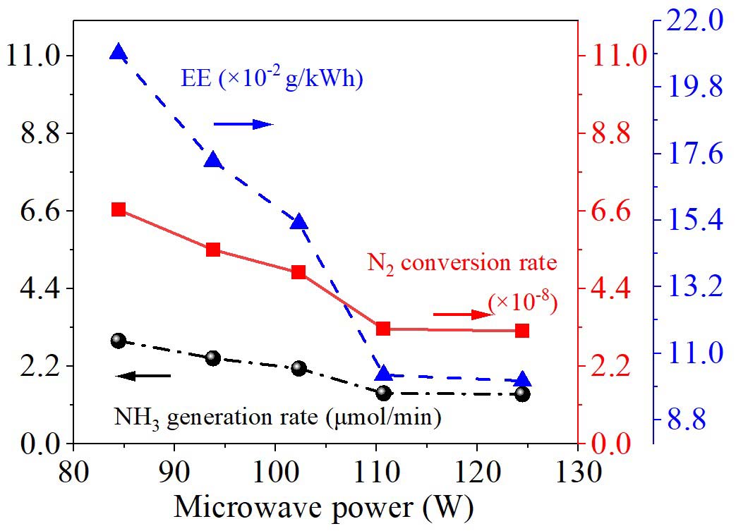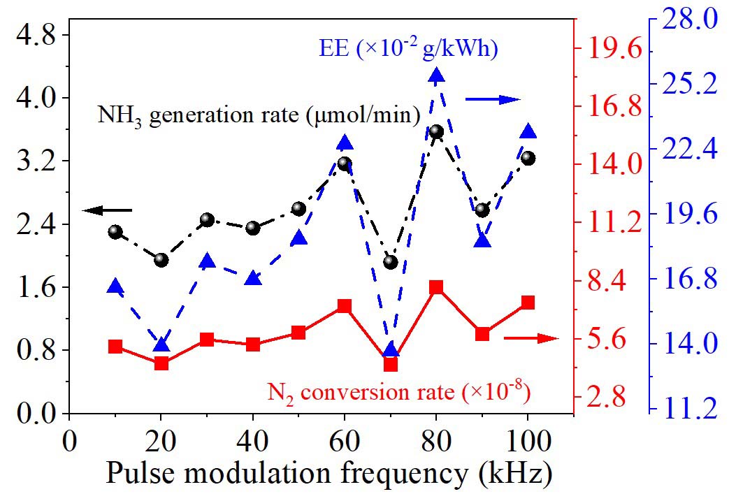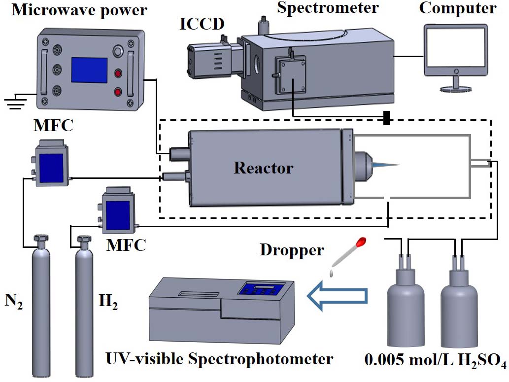 In this study, we explored a one-step direct synthesis of NH3 under mild experimental conditions utilizing pulse-modulated microwave plasma technology at atmospheric pressure. At a substantial gas flow rate, a microwave plasma jet was formed and the microwave-assisted ammonia synthesis can be realized. Impacts of various parameters including the gas flow rate, gas component, microwave absorbed power, pulse modulation frequency, and pulse duty cycle on ammonia synthesis were systematically investigated. To indicate the reaction path of ammonia synthesis, the distributions of both the gas temperature and active species were also studied using optical emission spectra technology. It is found that a considerable amount of ammonia was directly synthesized without involvement of any catalysts, the highest ammonia production rate and energy efficiency (EE), up to 2.93 μmol·min−1 and 6.64×10−2 g·(kW·h) −1, respectively, were achieved under low microwave power of 84.42 W. The duty cycle has obvious influences on the synthesis efficiency, compared to a duty cycle of 80%, the ammonia synthesis rate, EE and nitrogen conversion decreased by about 22% at a duty cycle of 100%. This finding underscores the significance of incorporating pulse modulation in the microwave discharge process for ammonia synthesis. Furthermore, it was found that vibrational excitation of microwave plasma has a significant driving effect on ammonia synthesis.