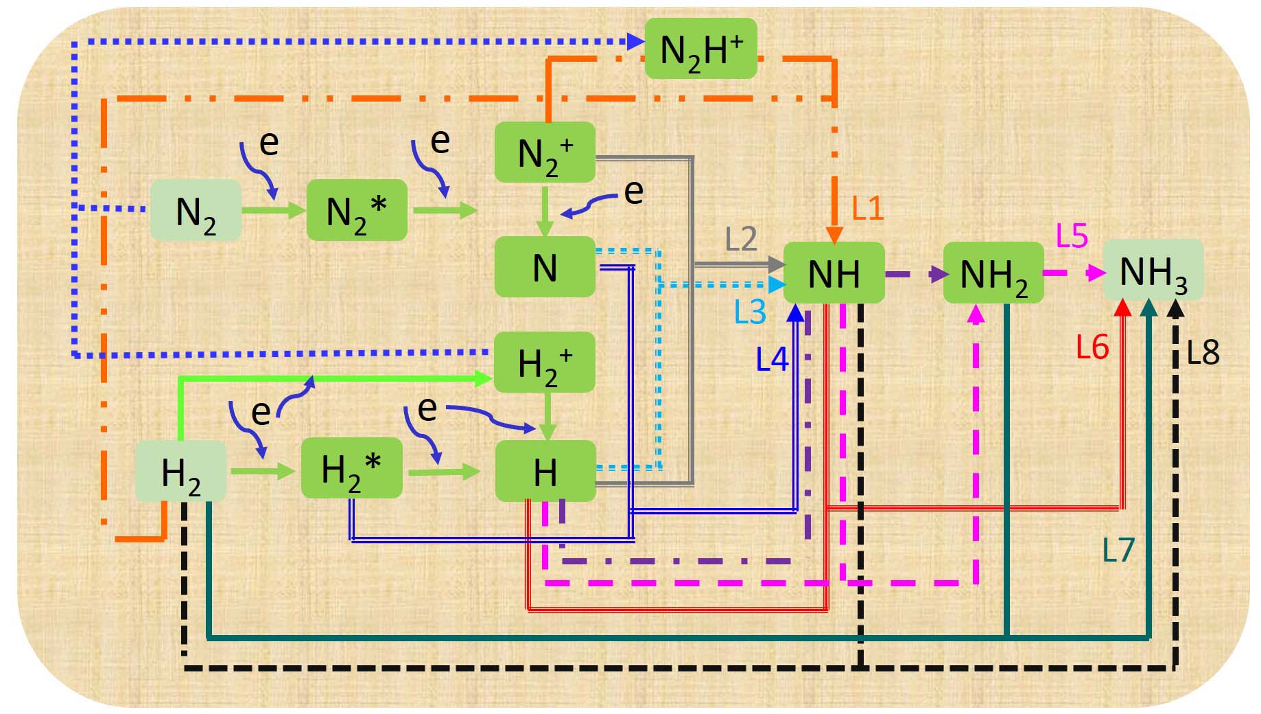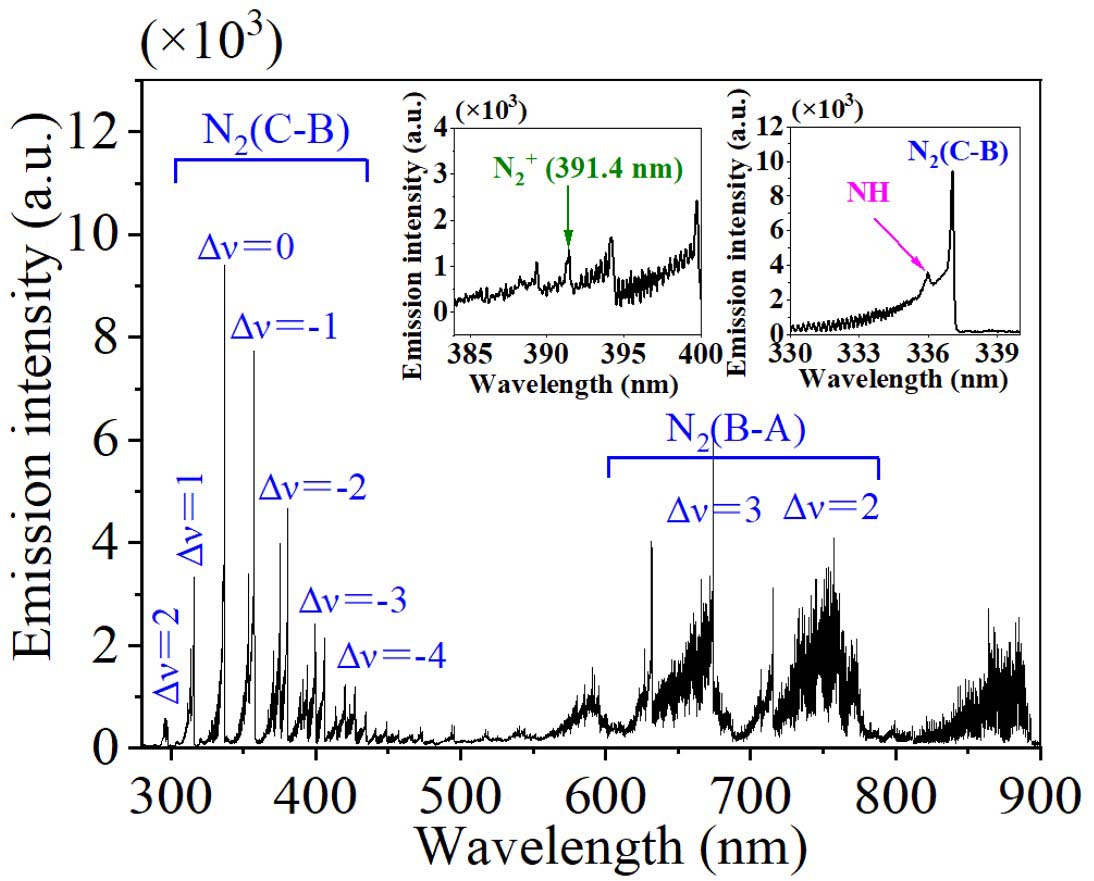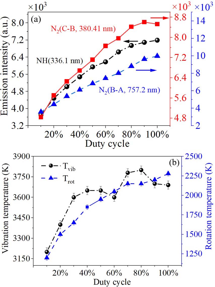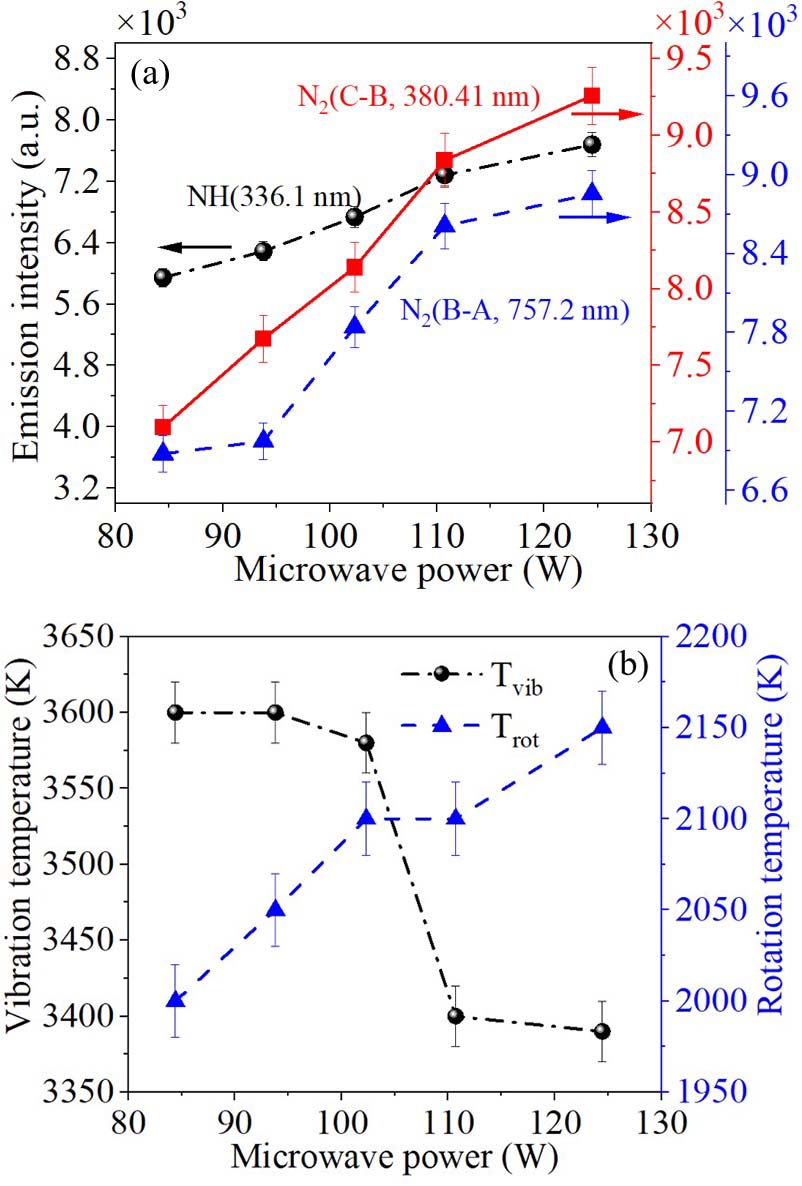 In this study, we explored a one-step direct synthesis of NH3 under mild experimental conditions utilizing pulse-modulated microwave plasma technology at atmospheric pressure. At a substantial gas flow rate, a microwave plasma jet was formed and the microwave-assisted ammonia synthesis can be realized. Impacts of various parameters including the gas flow rate, gas component, microwave absorbed power, pulse modulation frequency, and pulse duty cycle on ammonia synthesis were systematically investigated. To indicate the reaction path of ammonia synthesis, the distributions of both the gas temperature and active species were also studied using optical emission spectra technology. It is found that a considerable amount of ammonia was directly synthesized without involvement of any catalysts, the highest ammonia production rate and energy efficiency (EE), up to 2.93 μmol·min−1 and 6.64×10−2 g·(kW·h) −1, respectively, were achieved under low microwave power of 84.42 W. The duty cycle has obvious influences on the synthesis efficiency, compared to a duty cycle of 80%, the ammonia synthesis rate, EE and nitrogen conversion decreased by about 22% at a duty cycle of 100%. This finding underscores the significance of incorporating pulse modulation in the microwave discharge process for ammonia synthesis. Furthermore, it was found that vibrational excitation of microwave plasma has a significant driving effect on ammonia synthesis.