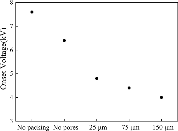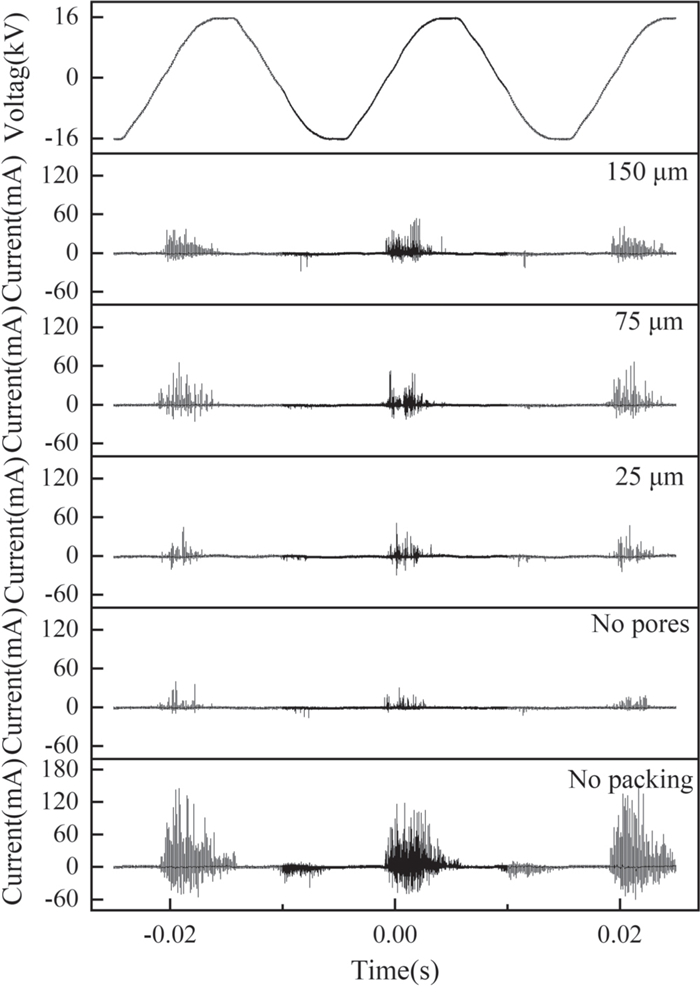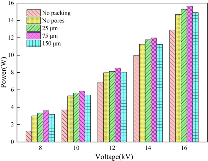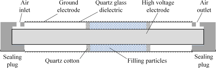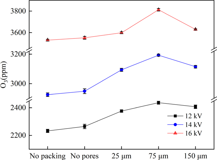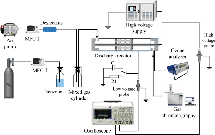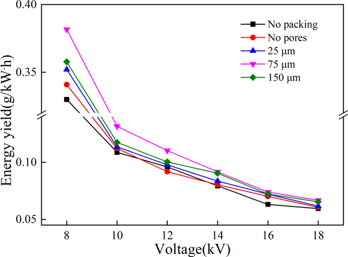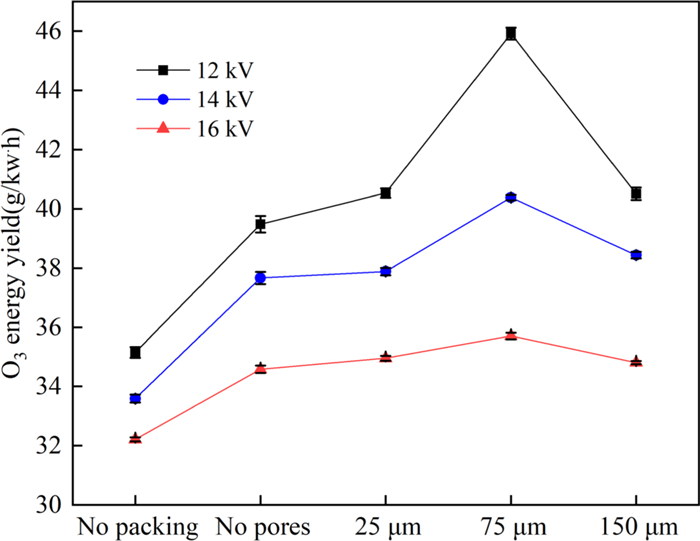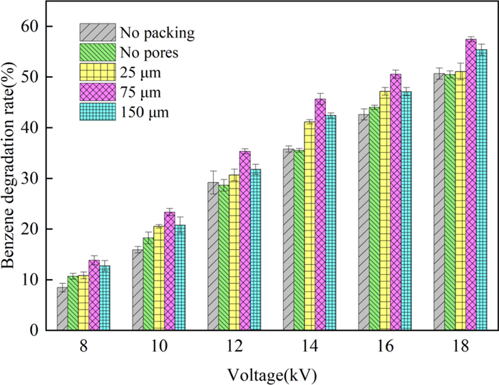 Recently, packed-bed discharge plasma technologies have been widely studied for treatment of volatile organic compounds (VOCs), due to the good performance in improving the degradation and mineralization of VOCs. In this paper, a coaxial cylindrical dielectric barrier discharge reactor packed with porous material of micron-sized pores was used for degradation of benzene, and the discharge characteristics and ozone generation characteristics were studied. When the discharge length was 12 cm and the filling length was 5 cm, the packed particles in the discharge area significantly increased the number of micro-discharges, and the current amplitude and density increased with the pore size of packed particles, but the discharge power and ozone concentration showed a trend of first increasing and then decreasing. The discharge power and ozone production reached the maximum when the size of pore former was 75 μm, correspondingly, the degradation efficiency of benzene was the highest.