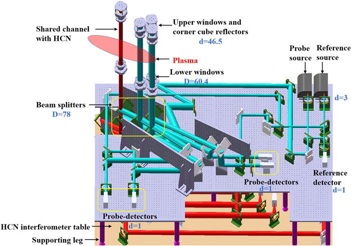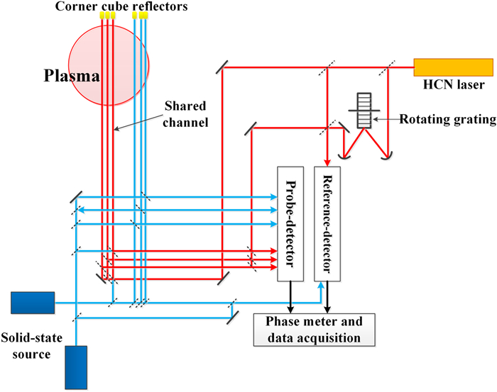 • A millimeter wave solid state source—far infrared laser combined interferometer system (MFCI) consisting of a three-channel 890 GHz hydrogen cyanide (HCN) laser interferometer and a three-channel 340 GHz solid state source interferometer (SSI) is developed for real-time line-integrated electron density feedback and electron density profile of the EXL-50 spherical tokamak device. The interferometer system is a Mach–Zehnder type, with all probe-channels measured vertically, covering the plasma magnetic axis to the outermost closed magnetic plane. The HCN laser interferometer uses an HCN laser with a frequency of 890 GHz as a light source and modulates a 100 kHz beat signal by a rotating grating, giving a temporal resolution of 10 μs. The SSI uses two independent 340 GHz solid-state diode sources as the light source, the frequency of the two sources is adjustable, and the temporal resolution of SSI can reach 1 μs by setting the frequency difference of the two lasers at 1 MHz. The main optical path of the two interferometers is compactly installed on a set of double-layer optical platform directly below EXL-50. Dual optical path design using corner cube reflectors avoids the large support structures. Collinear the probe-beams of two wavelengths, then the phase error caused by vibration can be compensated. At present, the phase noise of the HCN Interferometer is 0.08 rad, corresponding to a line-integrated electron density of 0.88×1017 m-2, one channel of measuring result was obtained by the MFCI system, and the highest density measured is about 0.7×1019 m-2.
